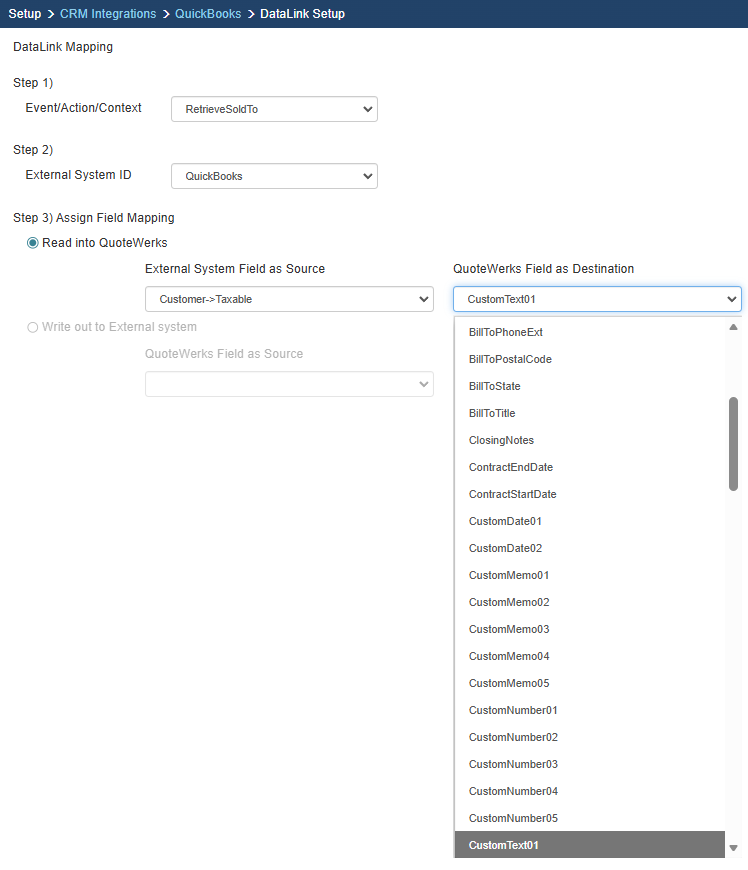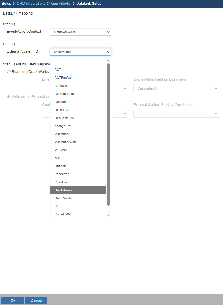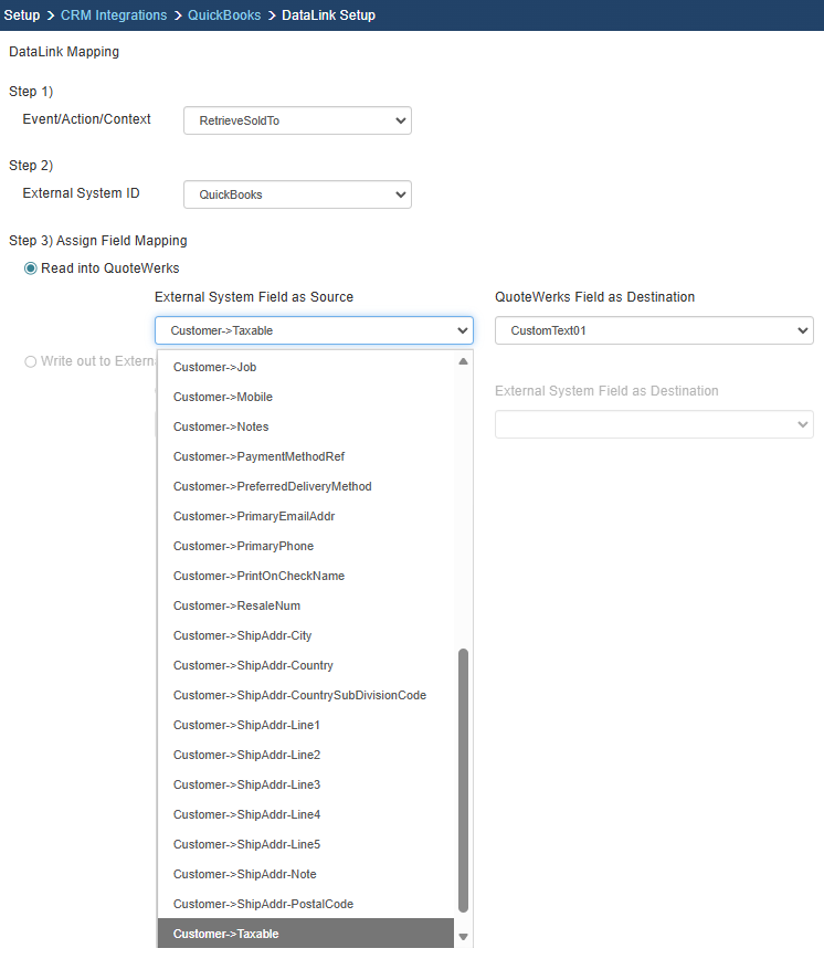 Step 6: Once your External field as source is selected, choose the QuoteWerks field that you would like the data from QuickBooks to populate in the QuoteWerks Field as a Destination.