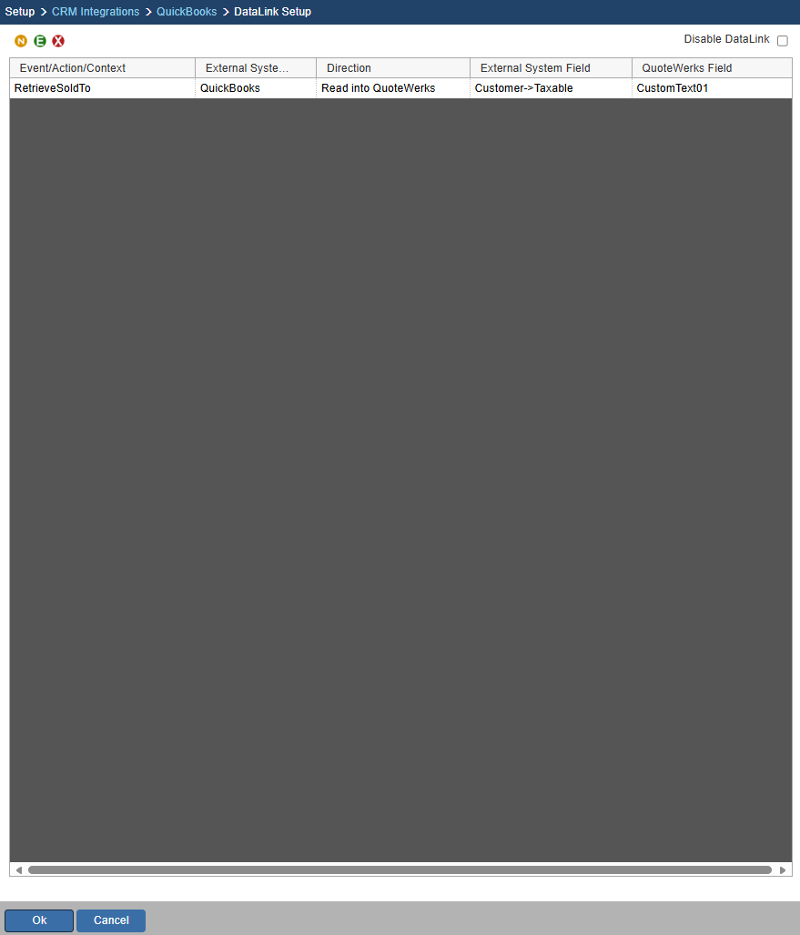 In the following example we are going to walk through how to pull the tax rate field from the QuoteWerks contact database and have it populate the tax rate field on the Sale Info tab. You can pull this and many other fields through the DataLink mapping window. You will need to create a new DataLink for each field you would like to populate however.