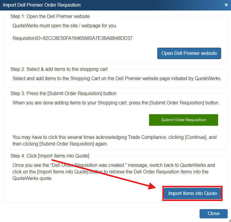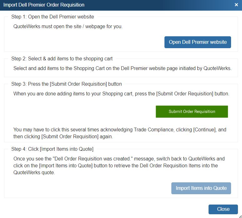 The QuoteWerks Dell integration enables Dell Premier Partners with Punchout credentials to import Dell order Requisitions from the Dell Premier portal. Users can initiate a new Dell order requisition from within QuoteWerks, choose items on the Dell website (or select a quote your Dell sales rep created for you), and then import those items into the QuoteWerks quote.