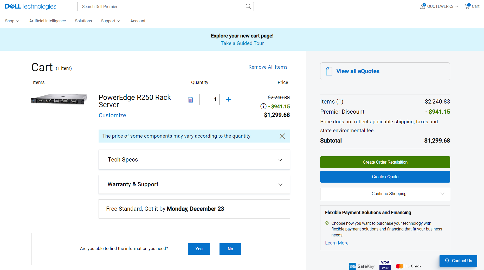 Start adding items to your shopping cart from the Dell site. After you have completed adding your items to the cart click on the [Create Order Requisition] button. Once it has successfully created the order requisition a confirmation message will appear. Switch back to QuoteWerks and click on the [Import Items into Quote] button to retrieve the Dell Order Requisition items into the QuoteWerks quote.