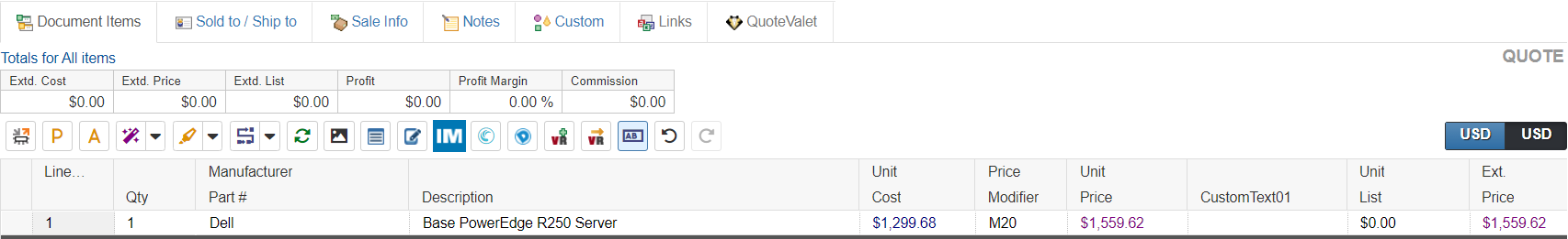 All items created for that requisition will now be pulled into QuoteWerks and listed on the DocumentItems tab. You can make any adjustments to the items if needed or send the quote as-is to your customer.