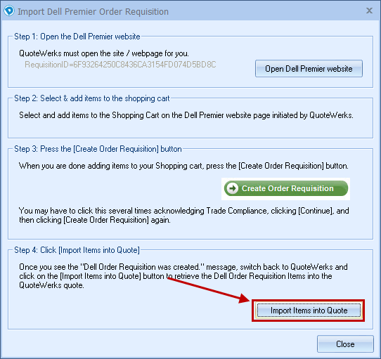 The QuoteWerks Dell integration enables Dell Premier Partners with Punchout credentials to import Dell order Requisitions from the Dell Premier portal. Users can initiate a new Dell order requisition from within QuoteWerks, choose items on the Dell website (or select a quote your Dell sales rep created for you), and then import those items into the QuoteWerks quote.