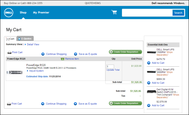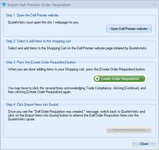 Start adding items to your shopping cart from the Dell site. After you have completed adding your items to the cart click on the [Create Order Requisition] button. Once it has successfully created the order requisition a confirmation message will appear. Switch back to QuoteWerks and click on the [Import Items into Quote] button to retrieve the Dell Order Requisition items into the QuoteWerks quote.