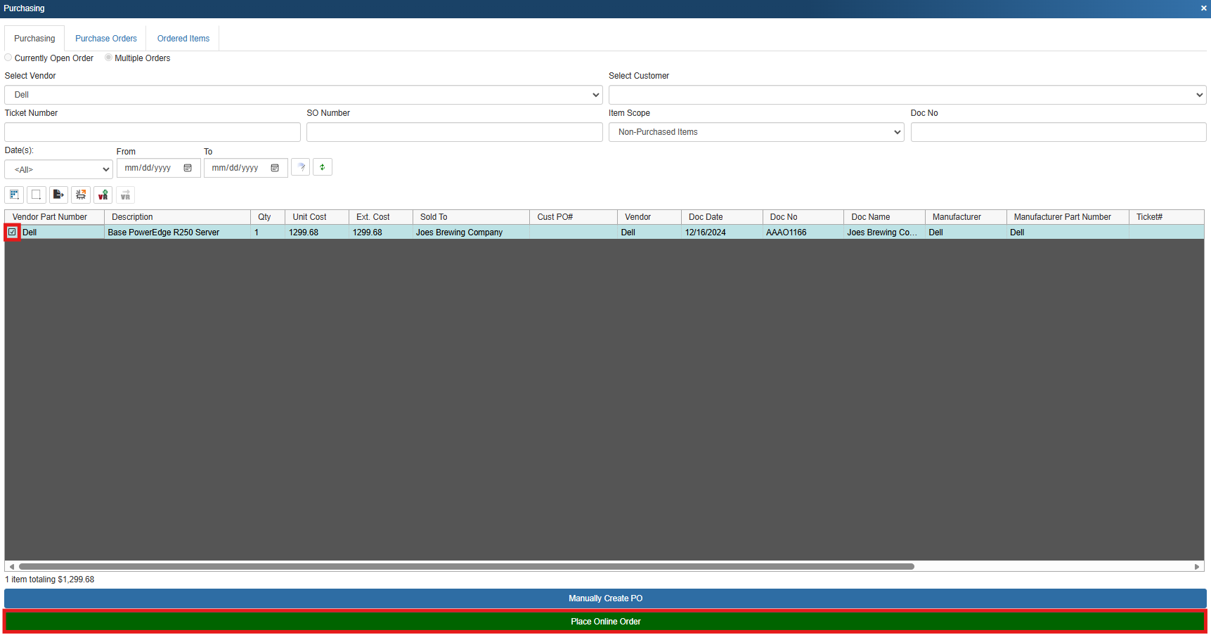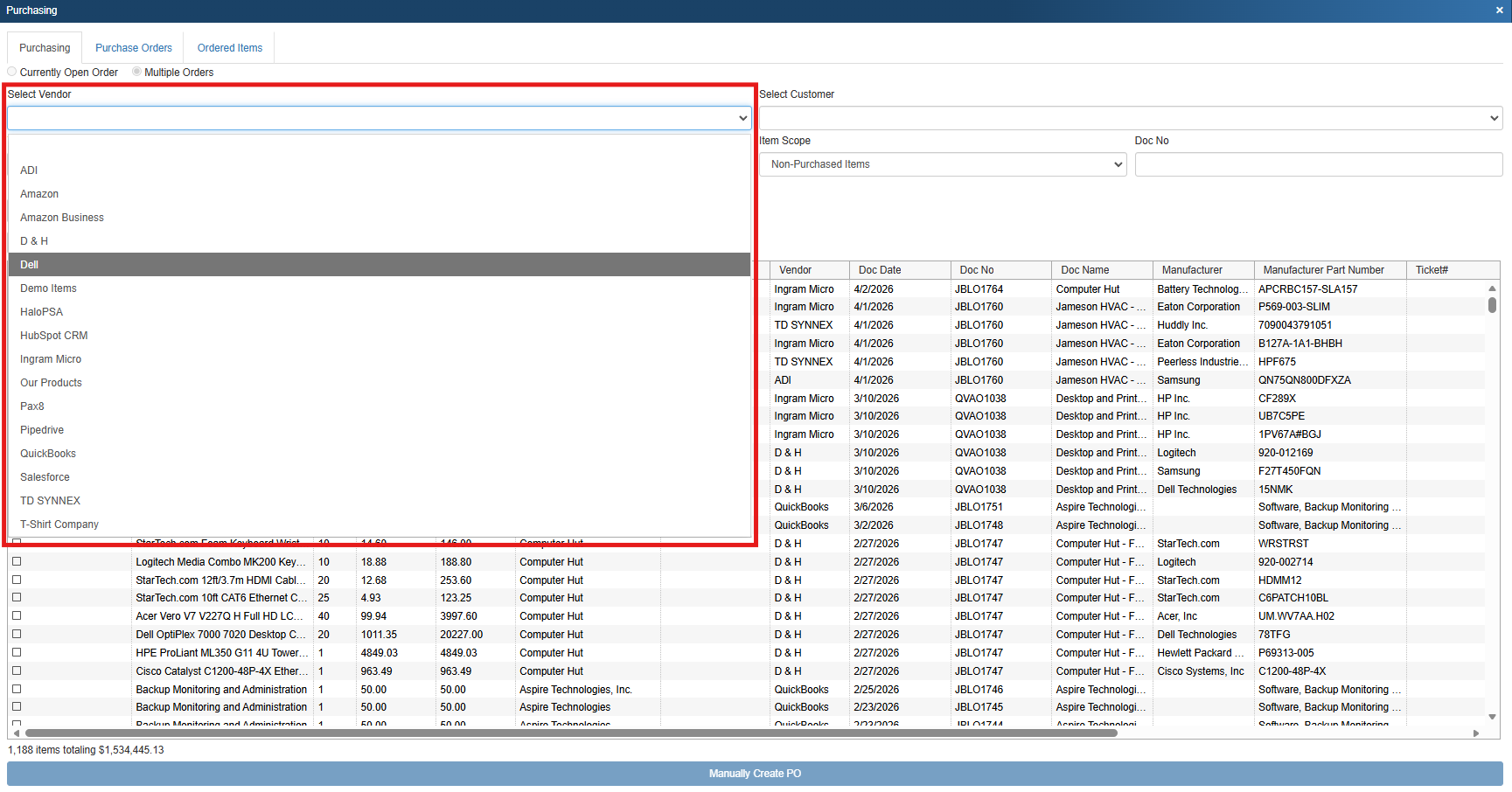 2. On the purchasing tab, select multiple orders, then Dell from the Select Vendor drop down list.