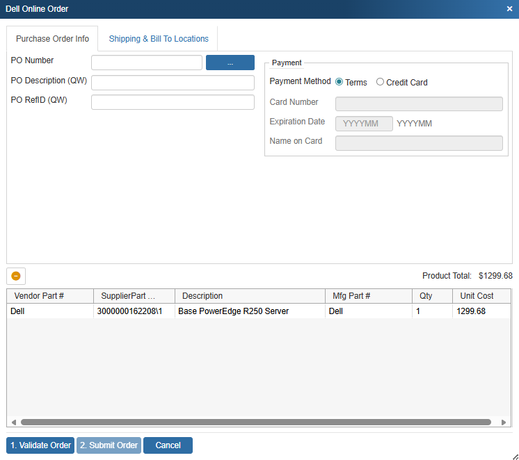 4. This opens the Dell Online Order window where you can assign a PO number, PO Description, PO RefID, and payment method.