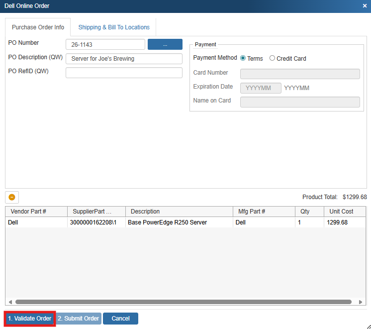 Dell Online Ordering is only available through the QuoteWerks Dell Punchout Integration. In order to place electronic orders through Dell you must first have completed the Dell requisition process as outlined in the above linked article. Once the quote created from that requisition has been converted to an order, the order will show up on the QuoteWerks Purchasing tab within the Purchasing module. To complete a Dell online order follow the steps outlined below.