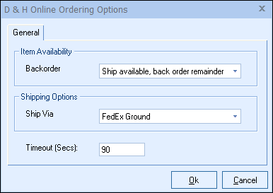 On the D&H Online Ordering Options window you can specify the default settings for the Online Ordering feature. These settings mostly control the defaults used when placing the order on the D&H Online Order Form described later.