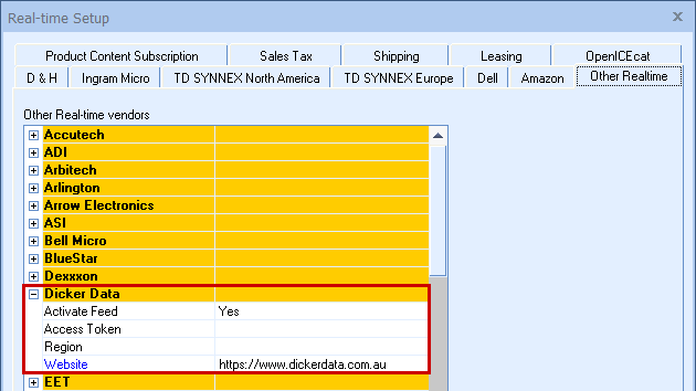 Dicker Data offers Real-time Pricing & Availability for Australia and New Zealand. An Access Token is needed to use Real-time Pricing and Availability specific to your account. You will need to contact Dicker Data for this Access Token. In addition to this feature, the QuoteWerks PartLocator service, included in the Product Content Subscription, downloads the price list data daily and makes it available to QuoteWerks users through the Real-time module. The QuoteWerks Real-Time Pricing & Availability will then query the PartLocator database and return the information most recently downloaded from Dicker Data.