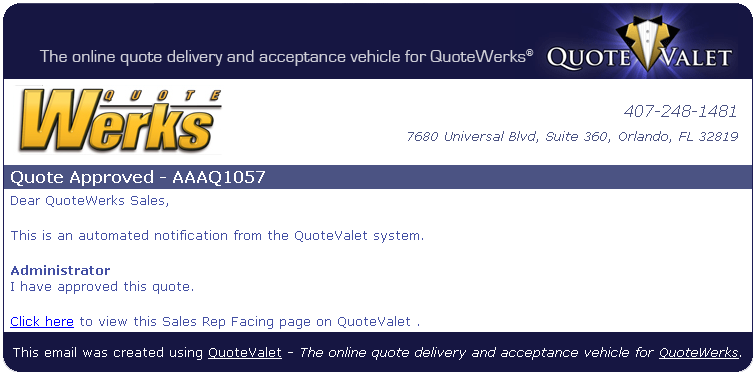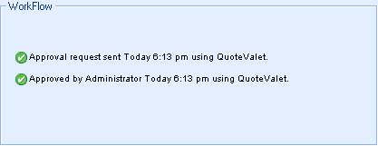 Once a document has been approved the user will be notified in a couple of different ways. The first is an email can be sent by the approver notifying the user that their document has been approved. The email window will launch automatically when a document is manually approved by using the File-> Approve Quote menu option. If it is approved via QuoteValet, an automatic email will be sent to the user notifying them that the quote has been approved.