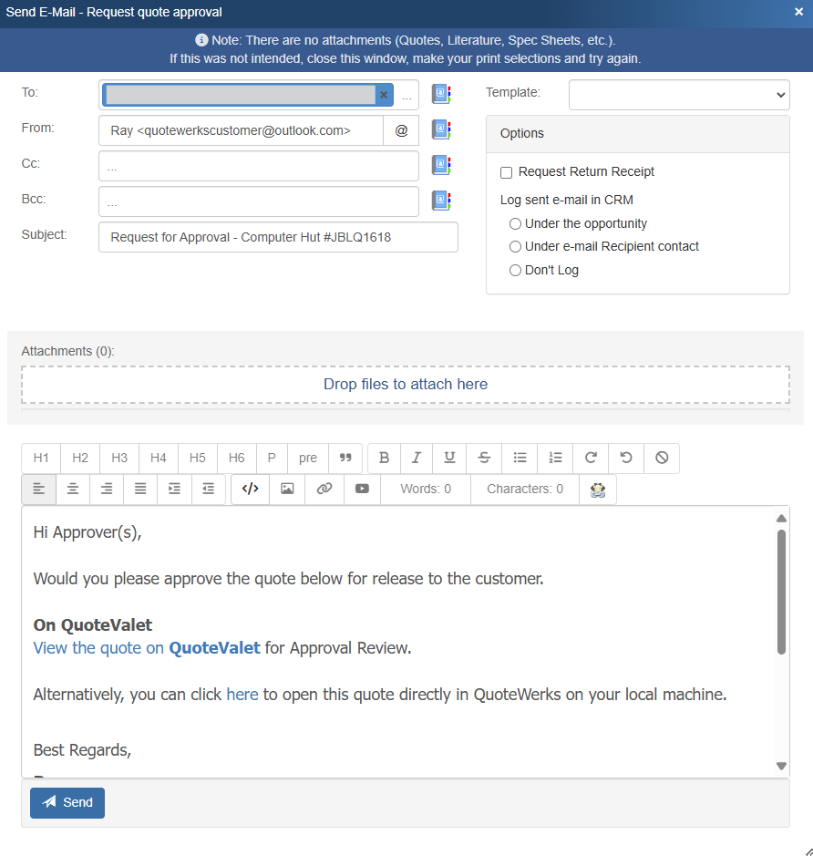 The QuoteWerks built-in email client will launch an email with a pre-populated message and a direct link to the document once the “Request Approval” button has been selected.