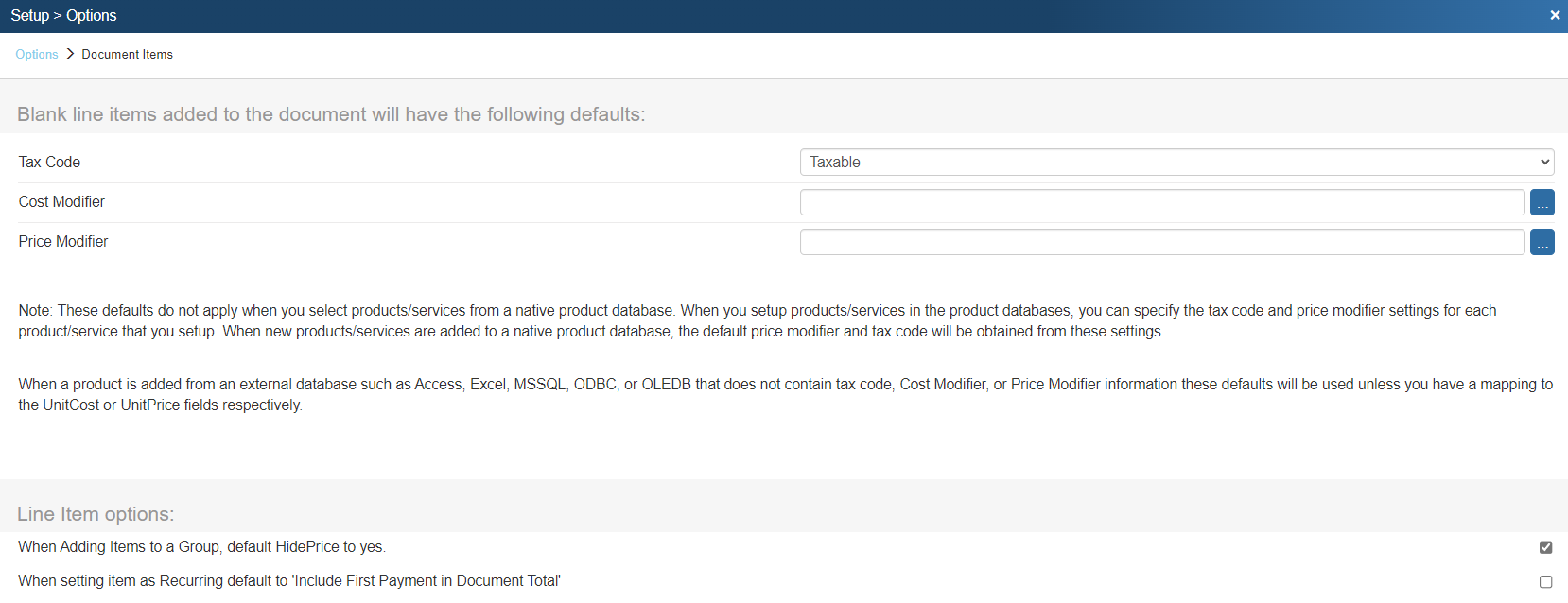 The Document Item page allows you to set defaults for blank line items added to the document. They include Tax Code, Cost Modifier, and Price Modifier. You also have the ability to select Line Item options as seen below.