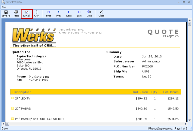 Once you've created a quote in QuoteWerks and would like to e-mail it, you can do so in one of two ways:
