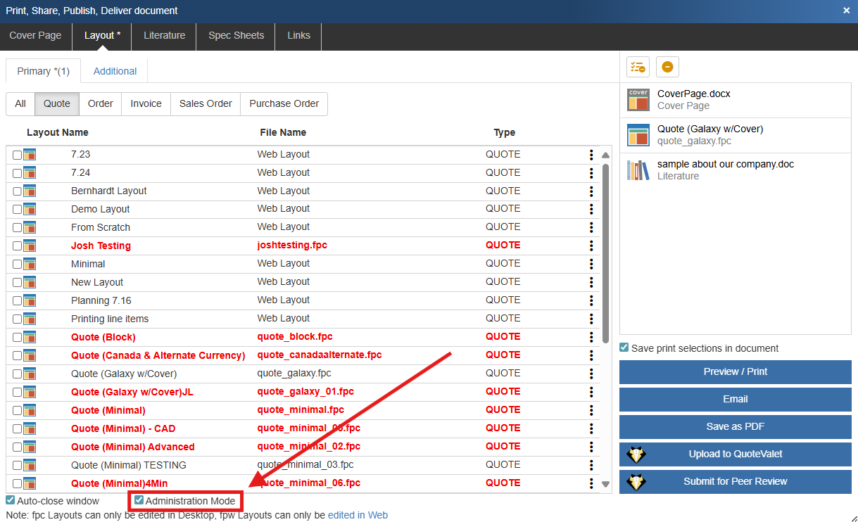 1.Click on the Administration Mode Checkbox to display all of your layout files.