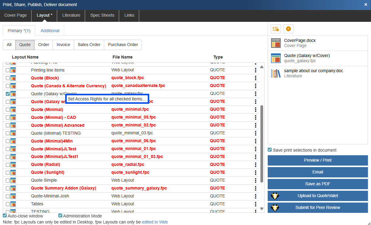Tip:You can select multiple files on the layouts tab only by holding CTRL on your keyboard and selecting the files. Once you have highlighted multiple files, simply-right click and choose the Set Access Rights menu. Mutli-select is not available for Cover pages or literature files.