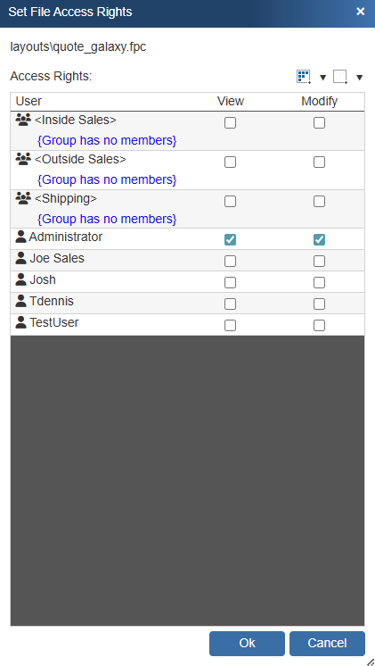 3.This will open the Set File Access Rights Window. Here you can select which of your users and groups are able to view and/or modify each layout or literature file you selected.