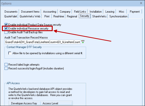 Important: When the "Enable Individual Resource Security" option is activated, all Covers, Print Layouts, and Literature files will be automatically hidden. You will need to start applying security rights for these to be visible. With this in mind, do not start applying security rights until everyone is out of QuoteWerks so you have time to make the necessary changes. |