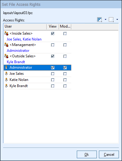 3.This will open the Set File Access Rights Window. Here you can select which of your users and groups are able to view and/or modify each layout or literature file you selected.