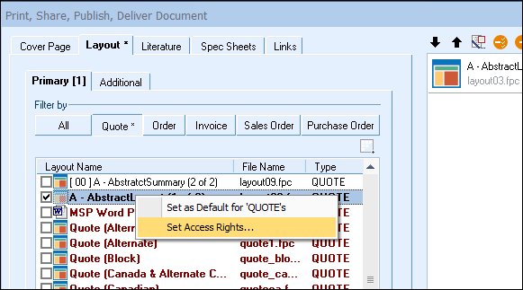 2.Any files in RED are files that DO NOT have any users setup to view or modify them. This means that until you add access rights to these RED files, they will not be visible to your other users when not in administration mode. To edit the access rights, right-click on a Print Layout or Literature file and choose Set Access Rights.