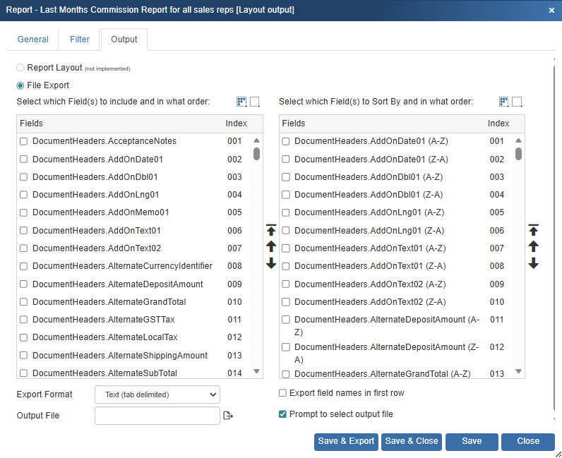 The Output File will display the default file name and location of the export file.  If this is not changed, when this report is exported this is the name of the file that will be exported.  If the report has not yet been exported, it will be blank and you will be prompted to set a file name and location.