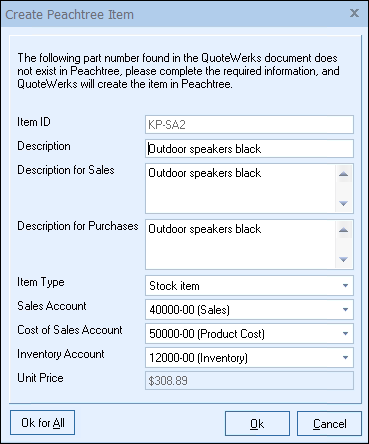 If the item record already exists, then based on the “If the Item does exist” option specified on the Transaction tab in the Sage 50 (Peachtree) link setup, the item price in Sage 50 (Peachtree) can be updated with the information from the line item in the QuoteWerks document (the unit price will be available in the "Create Peachtree Item" window to verify).