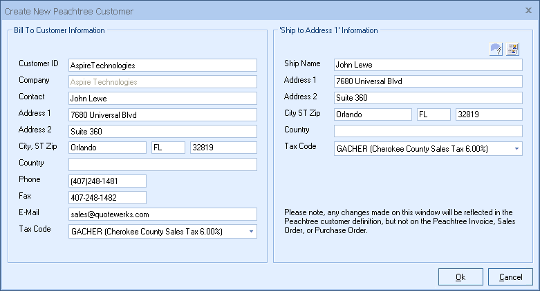 If the customer record already exists, then based on the “If the Customer does exist” option specified on the Transaction tab in the Sage 50 (Peachtree) link setup, the customer information in Sage 50 (Peachtree) can be updated with the information from the QuoteWerks document.