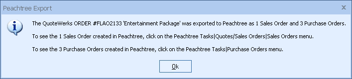 Once the document has been exported to Sage 50 (Peachtree) you will receive one of two messages. If you export a single document to Sage 50 (Peachtree) the “Peachtree Export” message box notification window will be displayed:
