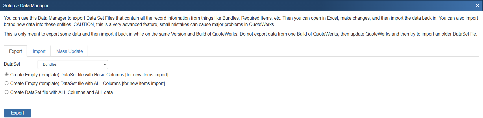 This option allows users to create a DataSet file that contains all columns relevant to the item being exported, as well as the data present within the item so it can be modified, transferred or backed up.