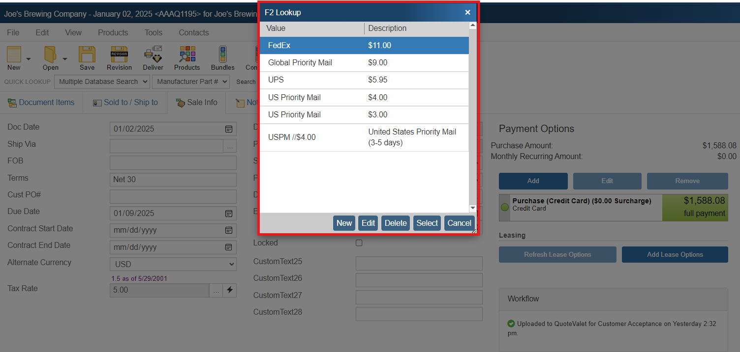For example, under the Sale Info tab of the Quote Workbook, the F2 feature could be used for fields such as Date, Ship Via, FOB, Terms, and Due Date.