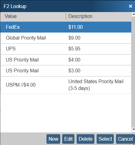 The F2 Lookup list usually contains a list of static text. For example, the ship via field would contain a list of FedEx, UPS, DHL, Airborne, etc.