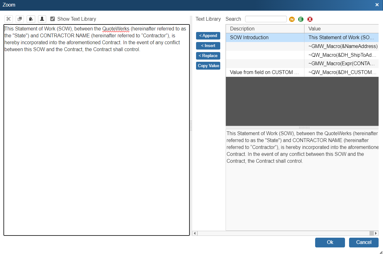 For Notes and Memo fields, the F2lookup lets you store a text library of large chunks of text that are searchable enabling you to easily compose your statements of work, terms, and other text intensive composition. It also allows you to Append, Insert, or copy the value from the library
