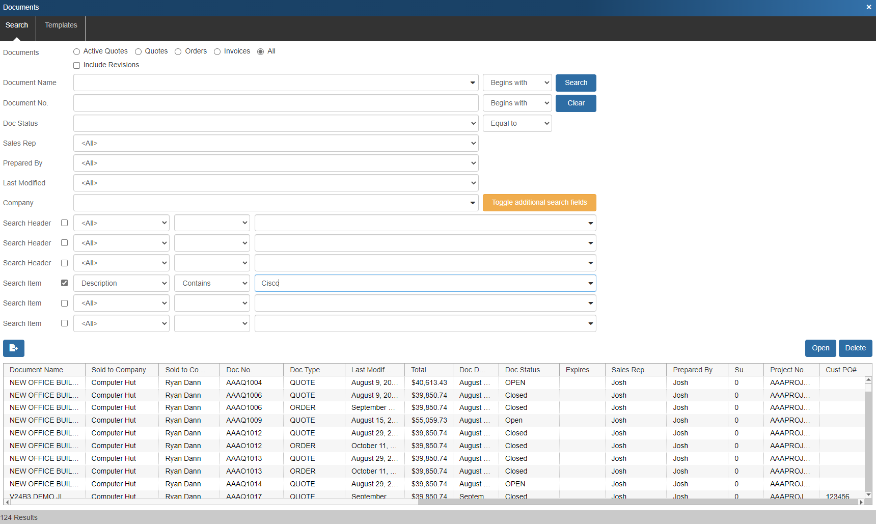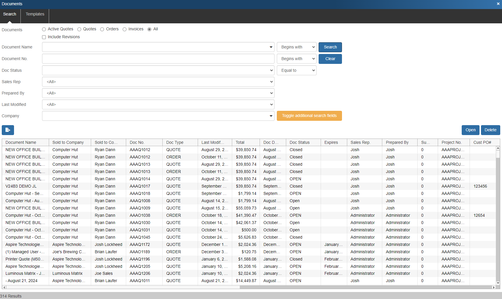 To search for a specific document, just type in a part of the quote’s name and click on the [Search] button to search for that quote. You can also click on the drop down arrow in the Document Name field, and this will display a list of the last 15 documents opened.