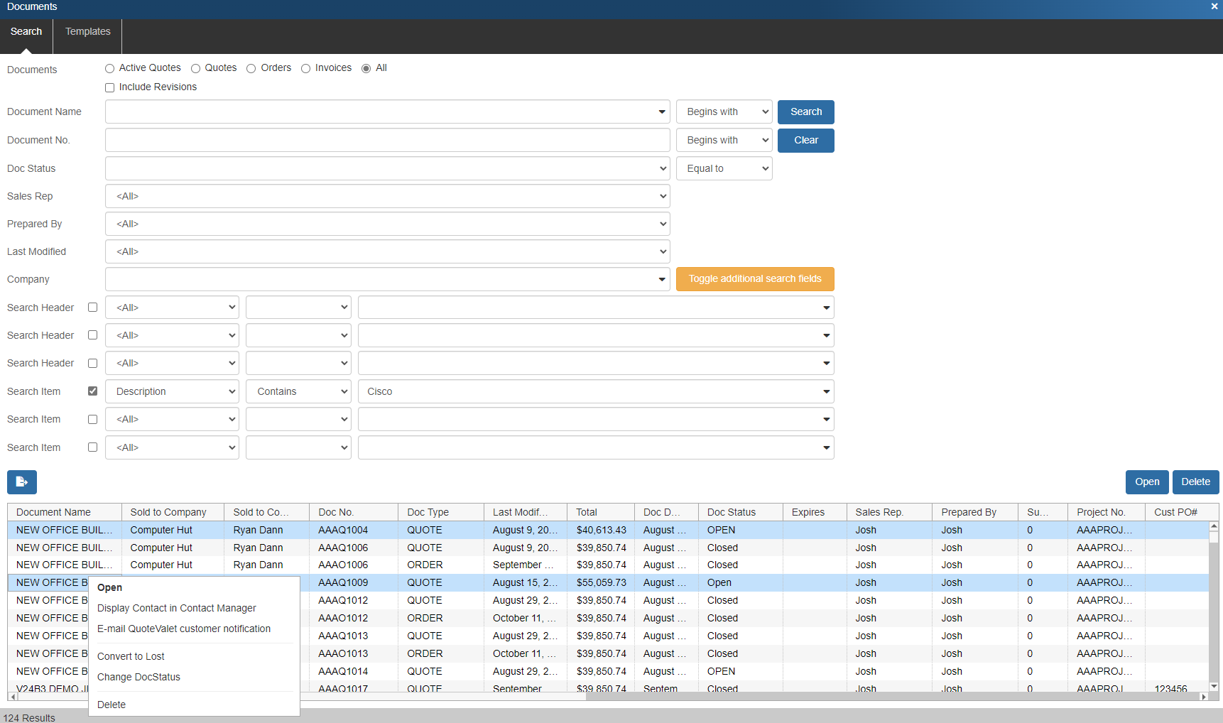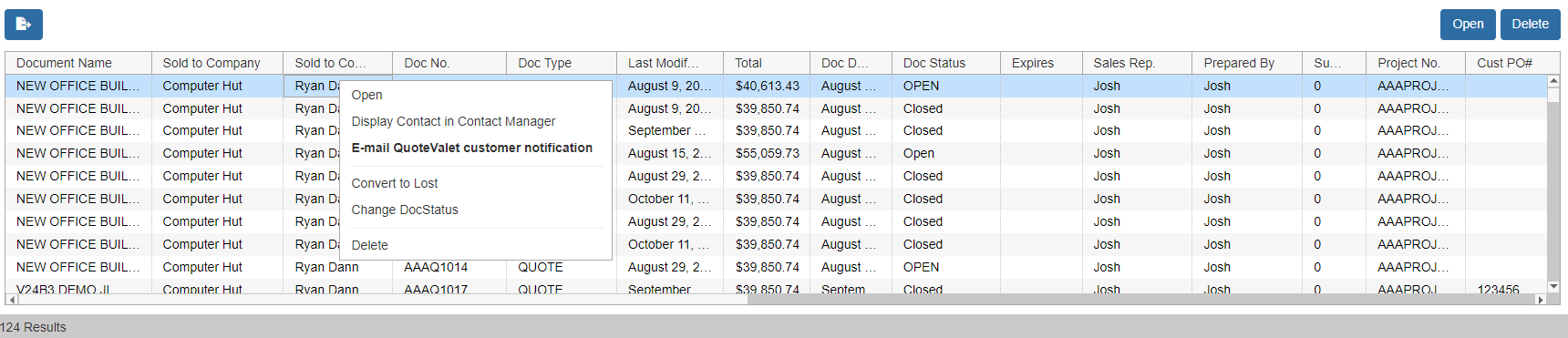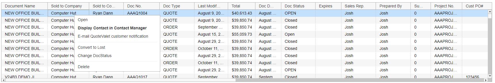 Right-clicking on a document will open a menu where users can either open a document, display the contact in contact manager, email the QuoteValet customer notification, convert it to lost, change the DocStatus, or Delete it (security rights required). If you highlight multiple documents you can update the status of the documents or convert a batch of documents to lost simultaneously.