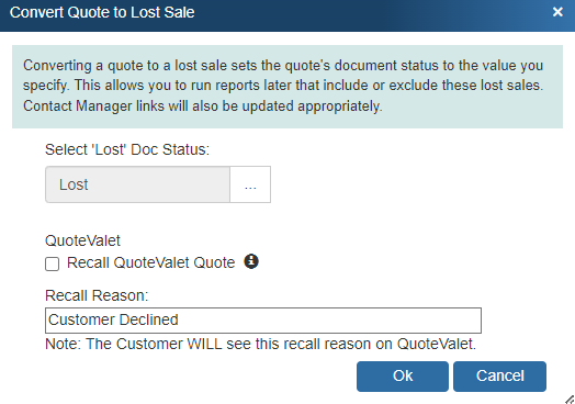 Choosing to convert single or multiple documents to lost will open the Convert to Lost menu where users will be prompted to confirm the change and if the document has been uploaded to QuoteValet, be prompted with the option to recall it.