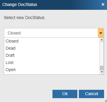 Selecting the Change DocStatus will allow users to update single or multiple quotes at one time with a new DocumentStatus. This is very useful if there are documents that were not updated properly during the normal sales process. Instead of having to update each one manually, you can update a batch of the documents.