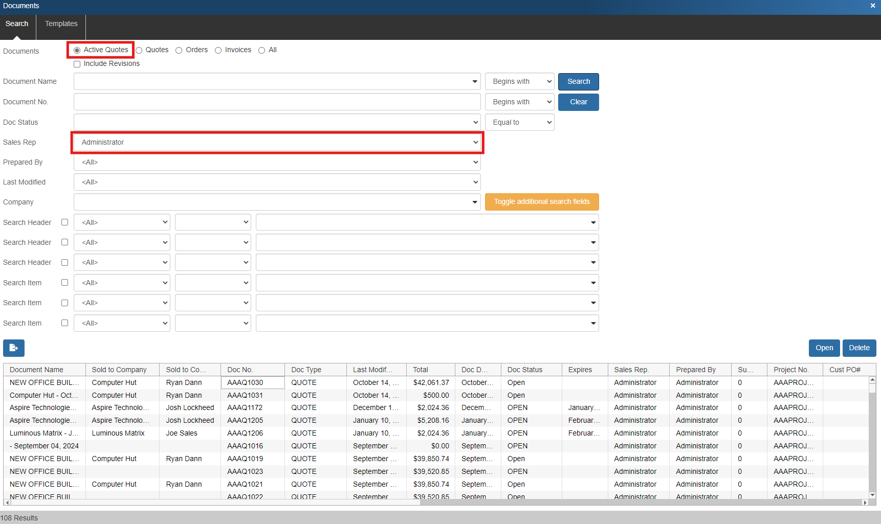 If these criteria are not set at all or are set incorrectly (for example, if the same value is set for all these criteria, like "Open" is set in all the fields), the "wrong" documents will be displayed as Active Quotes. If the results do not appear to correctly show only active quotes after you select the Active Quotes radial option and conduct your search, you need to verify these quotes' statuses and dates are correct.