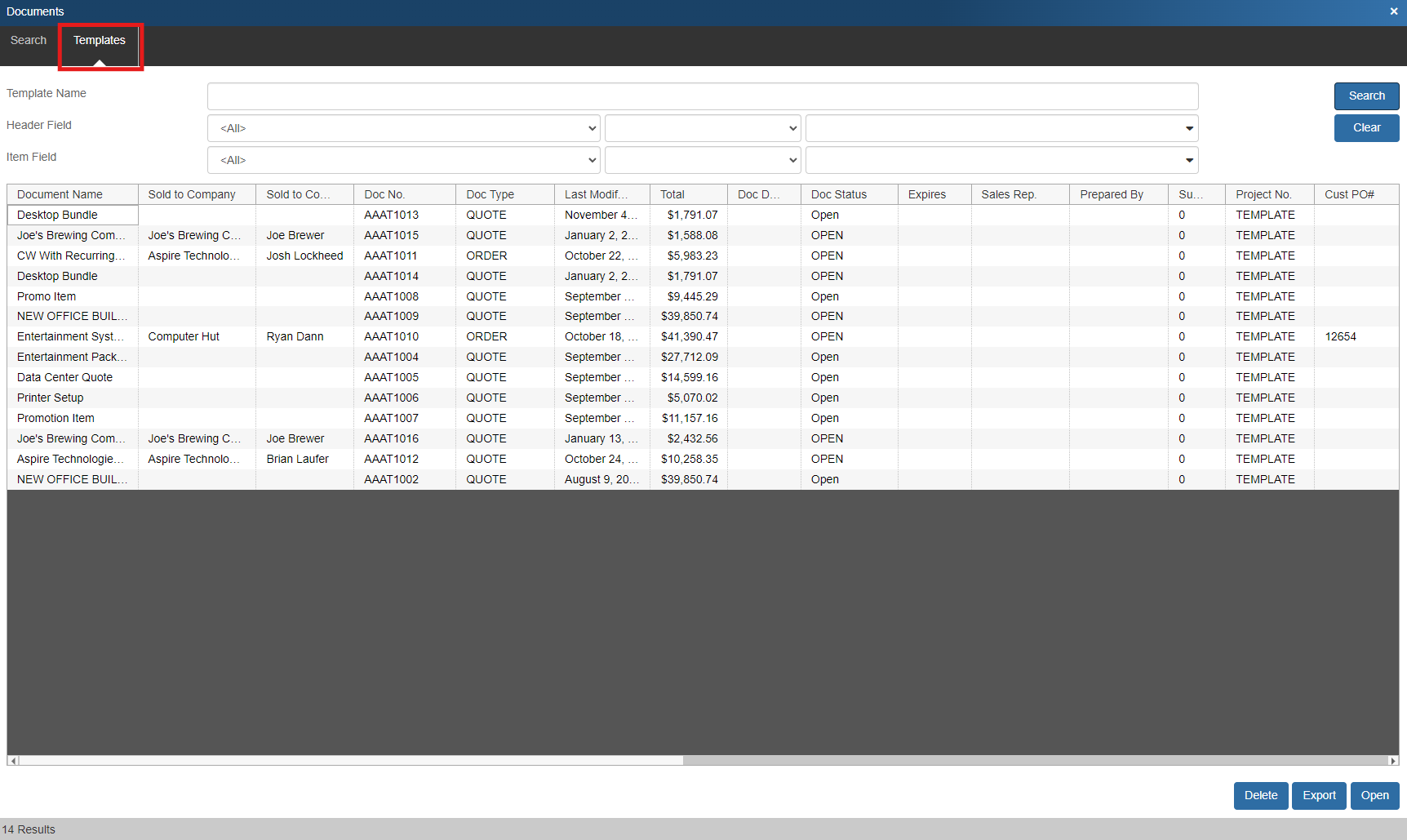 Click the Templates tab and hit search to view all templates. This selection will show you all the templates created in QuoteWerks. These templates will be sorted by the Last Modified date by default, but can be sorted by clicking on any of the other available columns. This is where users can make changes or delete any existing templates. For example, if a service is no longer being sold and it still exists on a template, you would come here to edit that template and remove or replace that service.