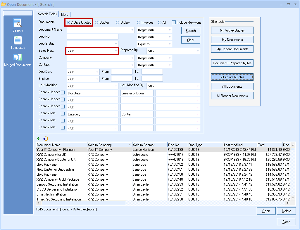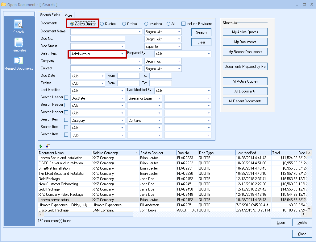 The My Active Quotes shortcut will display the current logged-in user's Active Quotes. When selected, the search fields will be updated with the "sales rep." field and the documents radial button changed to "Active Quotes".