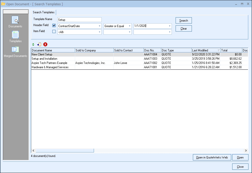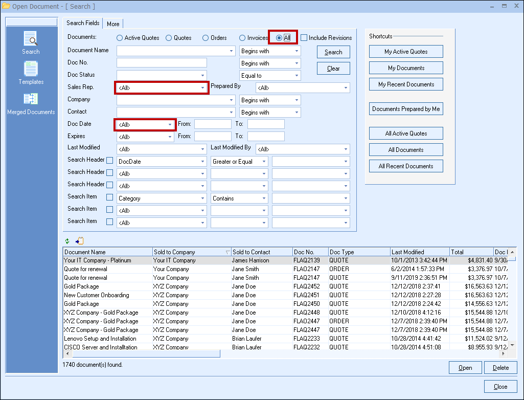 To search for a specific document, just type in a part of the quote’s name and click on the [Search] button to search for that quote. You can also click on the drop down arrow in the Document Name field, and this will display a list of the last 15 documents opened.