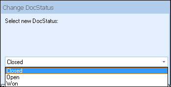 Selecting the Change DocStatus will allow users to update single or multiple quotes at one time with a new DocumentStatus. This is very useful if there are documents that were not updated properly during the normal sales process. Instead of having to update each one manually, you can update a batch of the documents.
