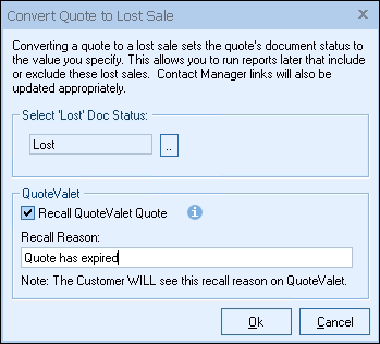 Choosing to convert single or multiple documents to lost will open the Convert to Lost menu where users will be prompted to confirm the change and if the document has been uploaded to QuoteValet, be prompted with the option to recall it.
