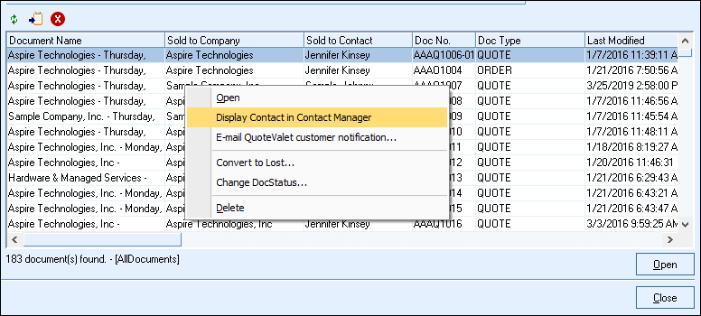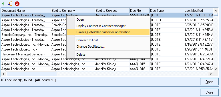 Right-clicking on a document will open a menu where users can either open a document, display the contact in contact manager, email the QuoteValet customer notification, convert it to lost, change the DocStatus, or Delete it (security rights required). If you highlight multiple documents you can update the status of the documents or convert a batch of documents to lost simultaneously.