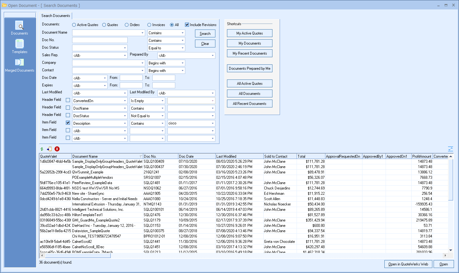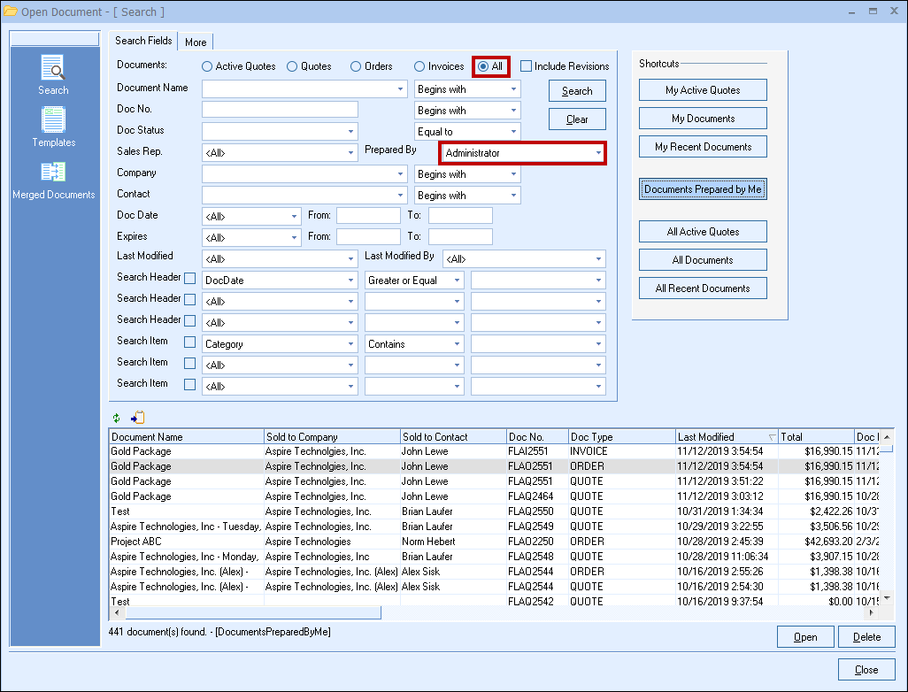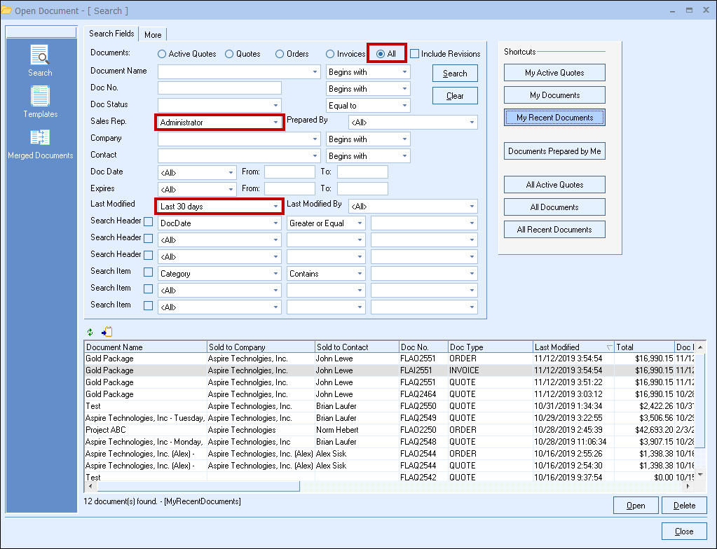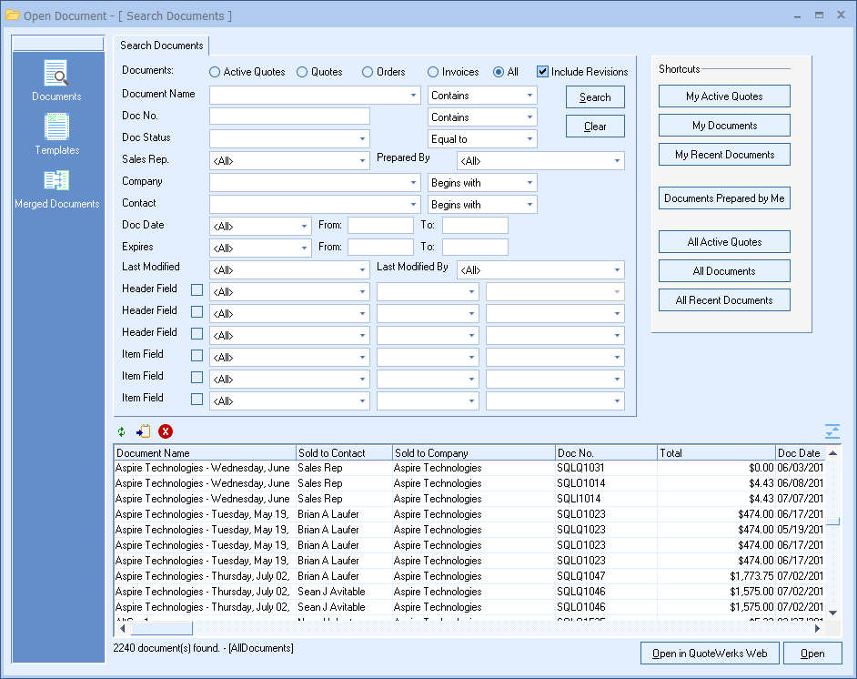 This shortcut will display all of the documents (per user's security settings) that have been created in QuoteWerks. This is the fastest way to see every document created in QuoteWerks: