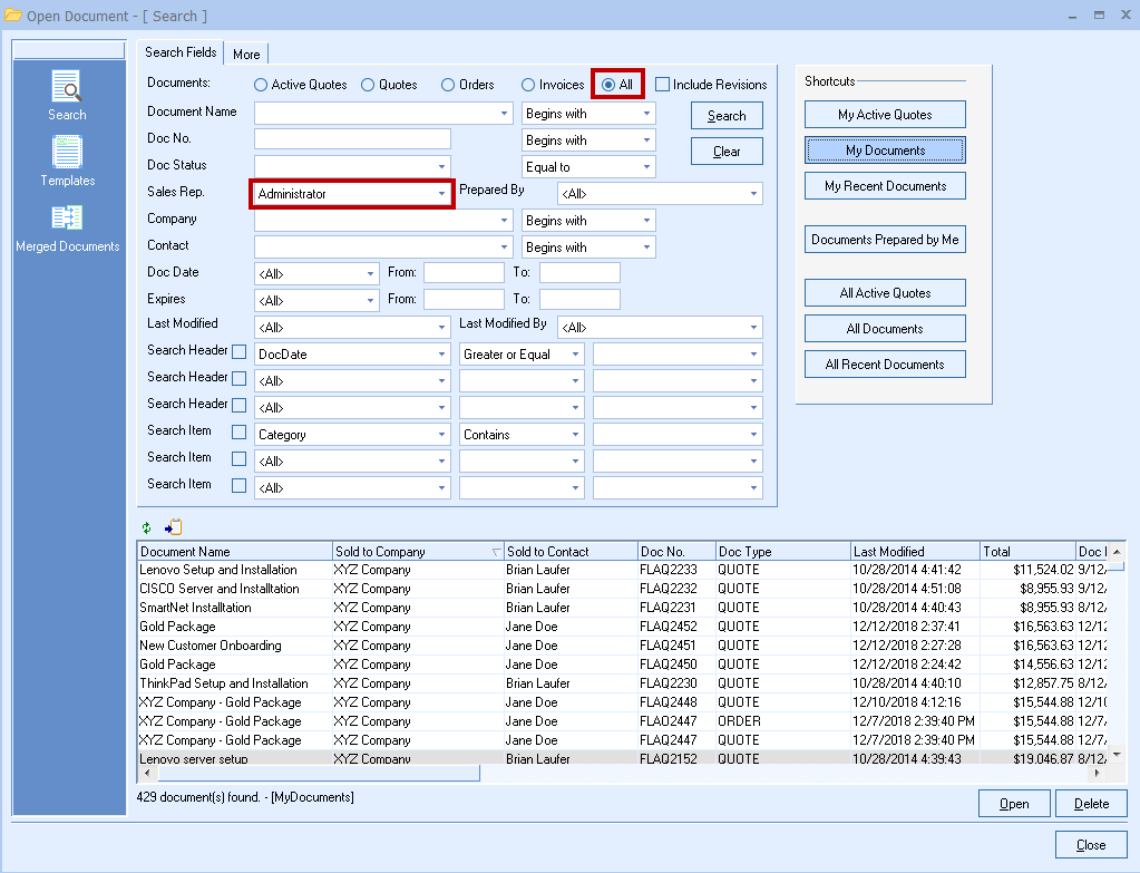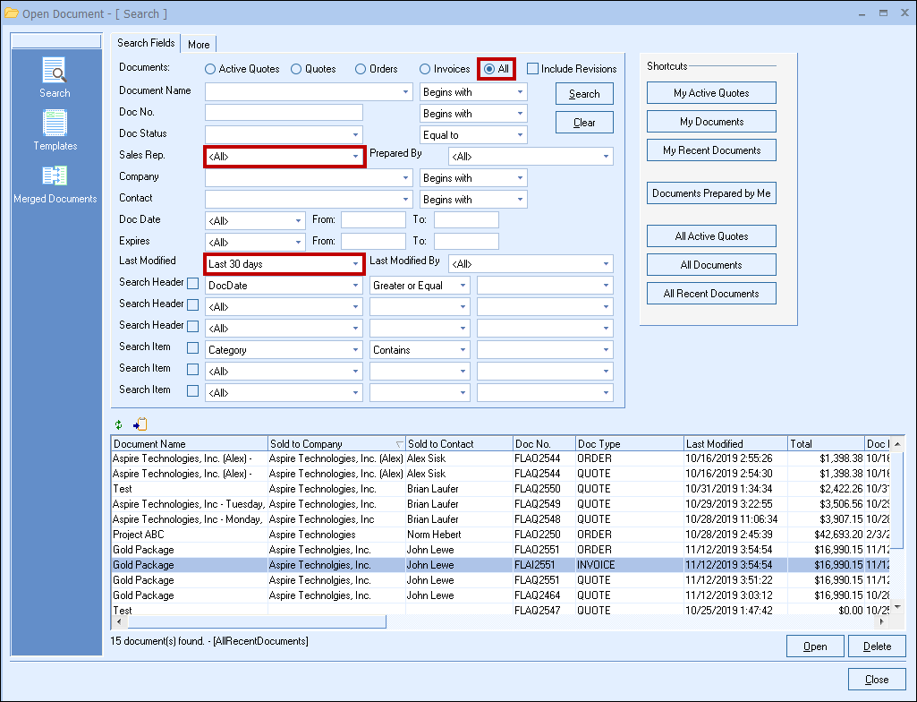 Users can add additional search criteria to these results after clicking on the My Documents button, but by default when you select this shortcut it will display all of the currently logged-in user's documents. This includes any closed or lost quotes, as well as orders and invoices.