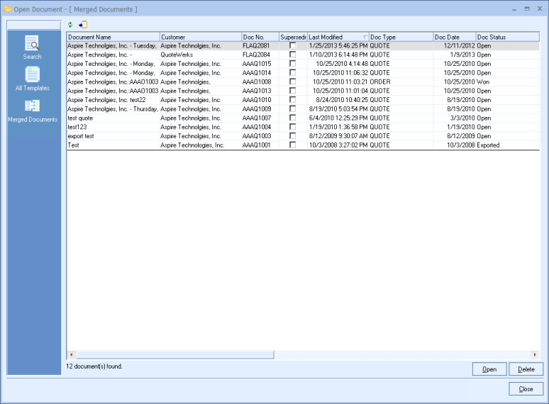This view will show you all of your documents in QuoteWerks: