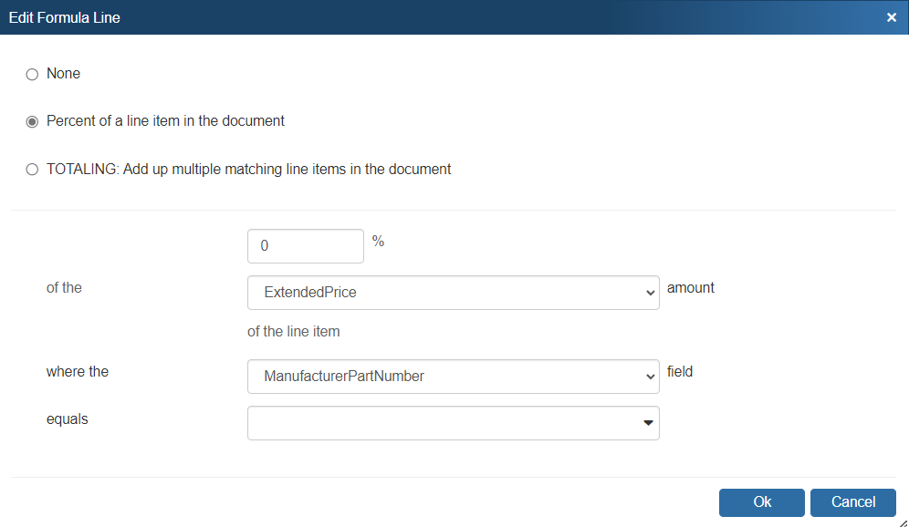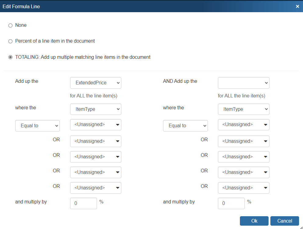 With this unit price formula, you can specify an item’s price as a percentage of one or multiple matching line items' Unit Price, Unit List, Extended Price, or Extended List. Choosing this method will allow you to set the price of an item as a calculation rather than a specified price.
