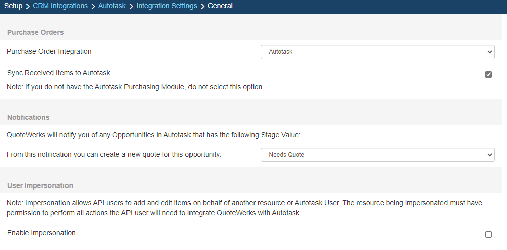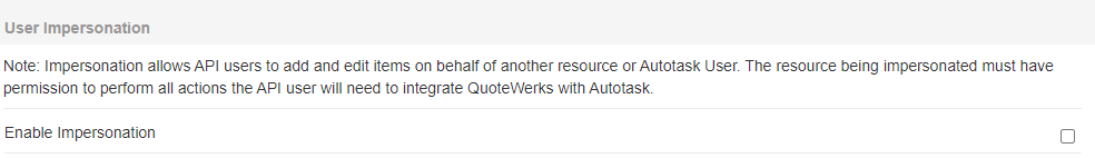 The User Impersonation setting allows API users to add and edit items on behalf of another resource or Autotask User. The resource being impersonated must have permission to perform all the actions the API user will need to integrate QuoteWerks with Autotask. Checking this checkbox will enable this setting.