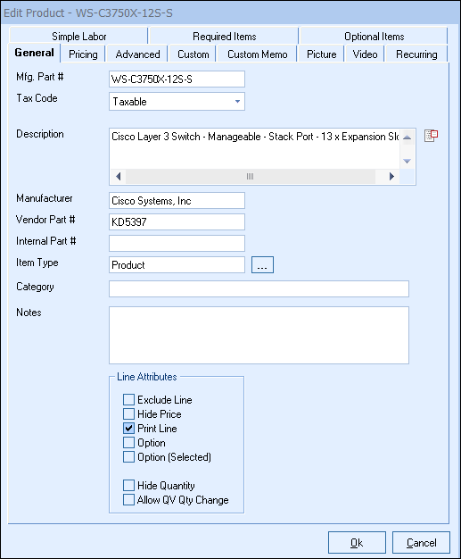 This field is used to more narrowly identify an item. The Product Lookup window allows you to search on this field. Examples of categories may include; Software, Hardware, Licenses, Annual, Semi-Annual, etc.