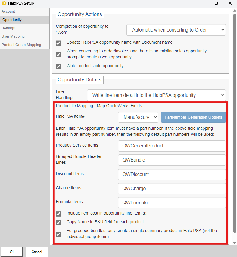 Each HaloPSA opportunity item must have a part number. If the field mapping results in an empty part number, then you can set how each item will be assigned a part number in the section below HaloPSA Item#.