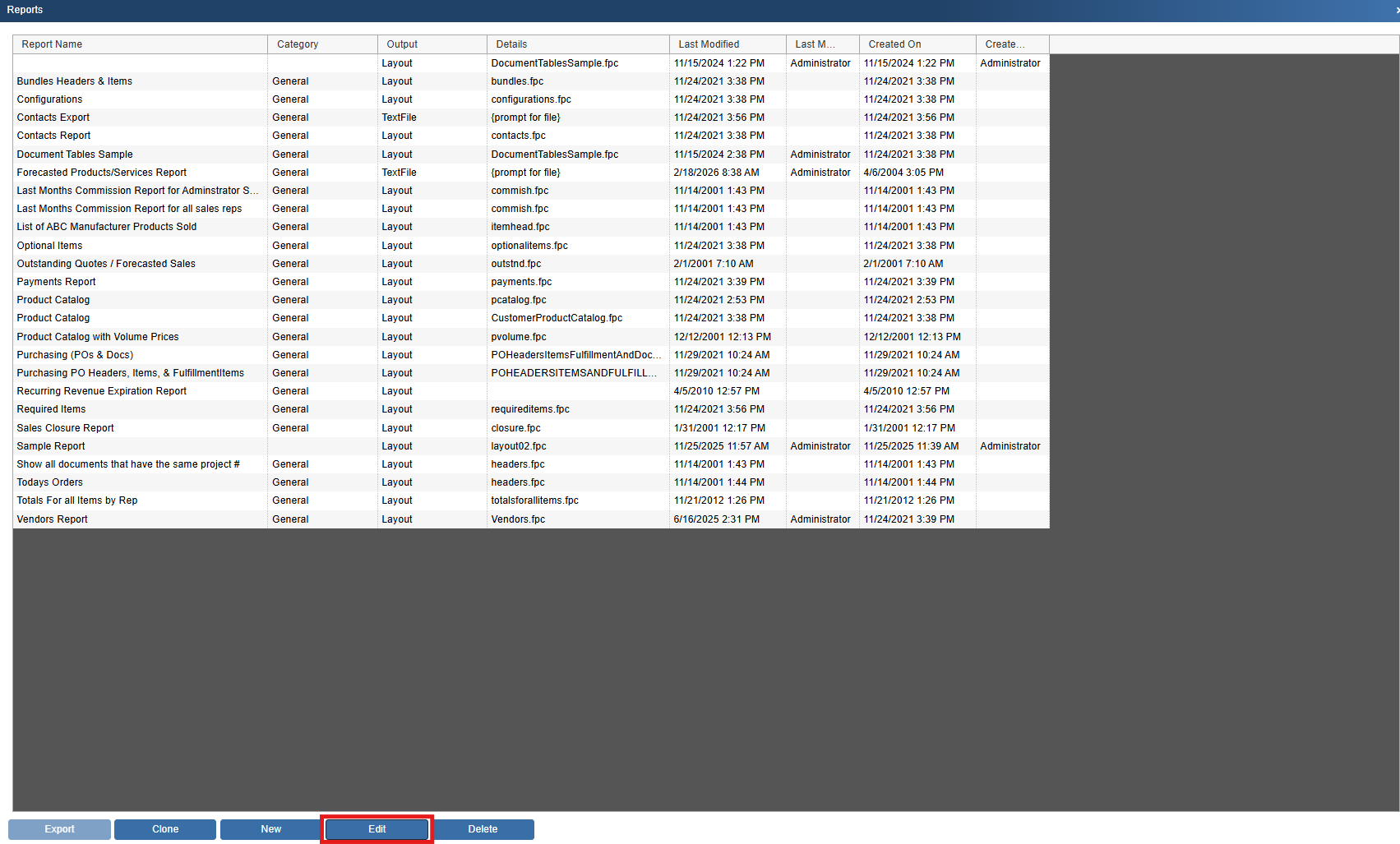 1) Highlight the report you would like to export to a CSV or Text file and click on the [Edit] button.
