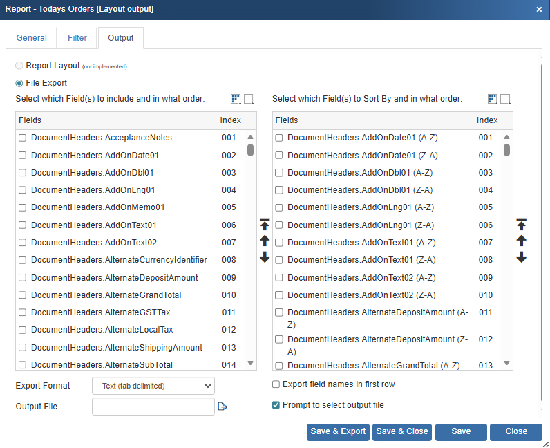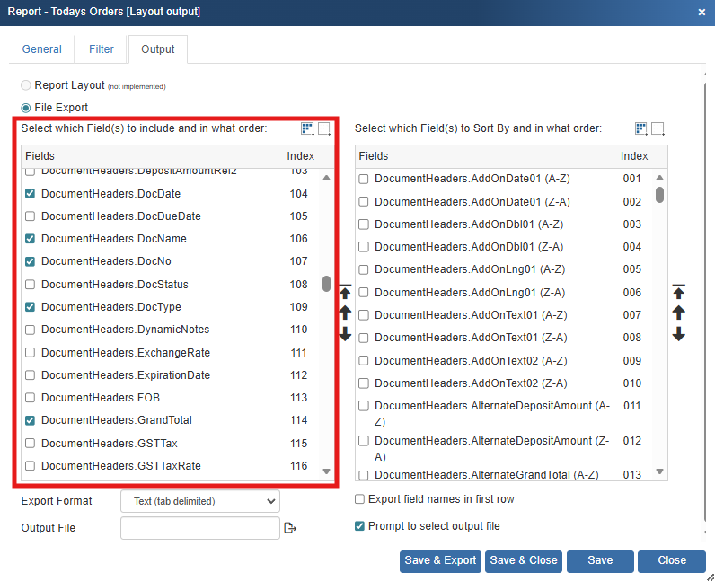 3) Next, start selecting the fields you want exported to CSV or Text file on the left hand side. On the right hand side, select the sorting fields (these are optional). The sorting field selections will let you sort based on the field data to order the information alphabetically or numerically. For example, if you wanted to sort by the Grand Total field from highest grand total to lowest grand total, you would select the field called DocumentHeaders.GrandTotal (Z-A).